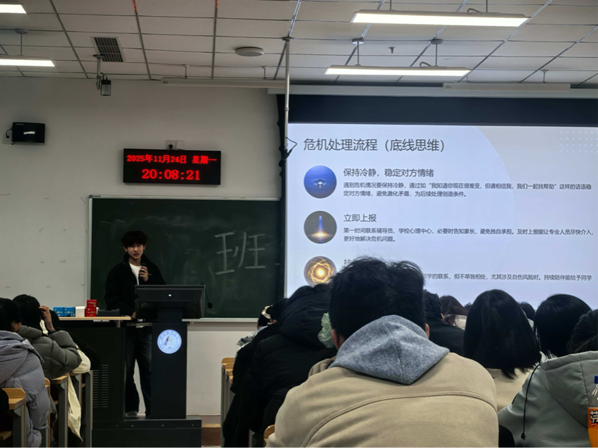 心协开展工作。在实践部分,他分享了日常班级氛围营造、同学关怀技巧以及应对心理问题的方法,并提出了保持专业边界感、维护自身心理健康、持续参与心理培训、及时向老师汇报等建议。